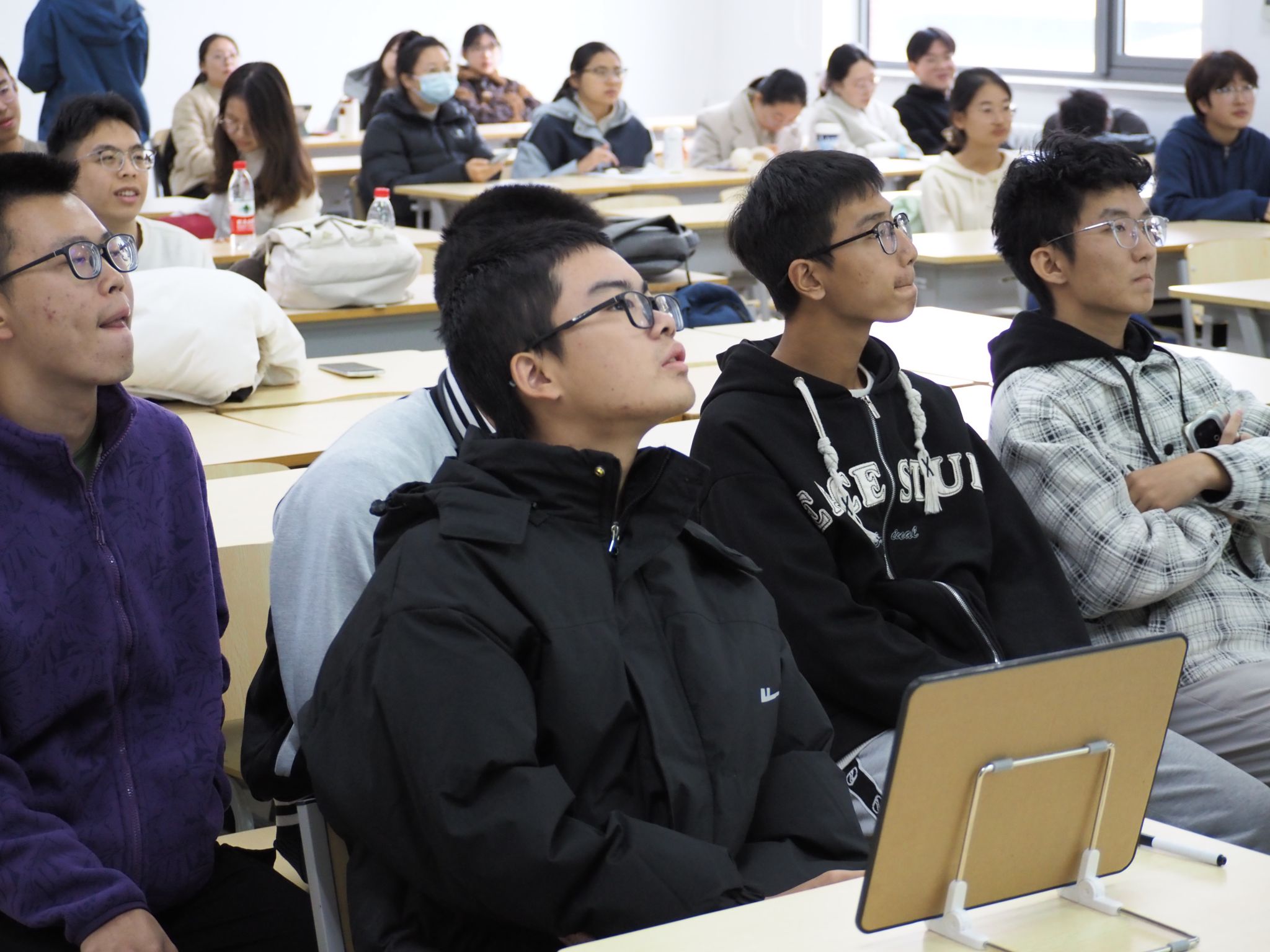 本次擂台赛赛制在原有的基础上进行了升级,让比赛更刺激,小组赛阶段四队一组,将去年的5题积分淘汰制改为“答错即淘汰、队内补位”的模式,取积分前2位晋级,每分每秒都是考验。淘汰赛阶段对分值设置进行了优化,使难度与分值精准匹配,考验了同学们知识储备和临场应变能力。经过激烈的现场比拼,“π队”成为本次环保知识擂台赛的擂主。
